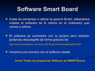 El documento proporciona instrucciones para instalar el software Smart Board, conectar la pizarra digital al computador a través de USB y cable de video, y orientar la pizarra para calibrar la interacción táctil. Se debe instalar primero el software, luego conectar físicamente la pizarra al computador a través de USB y video, y finalmente usar la orientación en el software o en el panel de control para calibrar la posición táctil.