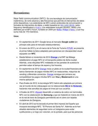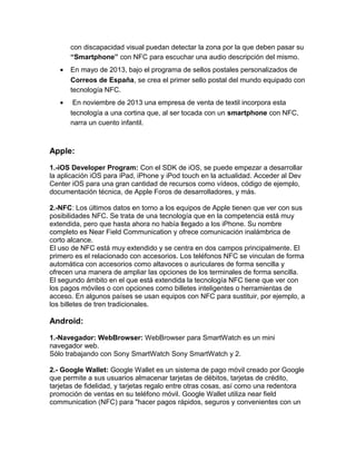 La tecnología NFC permite el intercambio de datos entre dispositivos de forma inalámbrica y de corto alcance. Se han desarrollado varias aplicaciones de NFC como pagos móviles, billetes electrónicos y accesorios vinculados automáticamente. Mientras que Android e iOS permiten el desarrollo de aplicaciones NFC, los dispositivos de Apple aún no incluyen soporte para NFC.