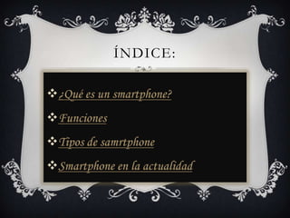 Este documento describe las características y funciones de los teléfonos inteligentes, incluyendo su capacidad para enviar y recibir correo electrónico, instalar aplicaciones, acceder a Internet a través de WiFi o 3G, y utilizar funciones como cámaras, GPS y programas de navegación. También enumera los principales sistemas operativos para teléfonos inteligentes y aconseja no dejarse impresionar por nuevos dispositivos que no satisfacen realmente las necesidades del usuario.