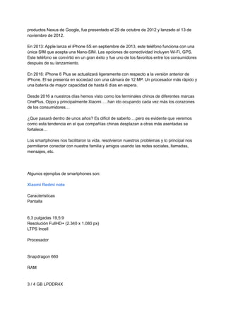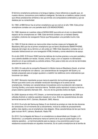 El documento resume la evolución de los smartphones desde 1994 hasta la actualidad. Comenzó con el IBM Simon en 1994, que tenía una pantalla táctil monocromo. Luego aparecieron modelos como el Nokia 9000 en 1996, el Blackberry 850 en 1999 y el Ericsson R380 en 2000. En 2007 salió el iPhone de Apple, que fue un hito tecnológico. Más tarde llegaron dispositivos como el HTC Dream en 2008 y el Samsung Galaxy S en 2010. En la actualidad, marcas chinas como Xiaomi, Oppo y OnePlus han ganado popularidad. Los smartphones nos