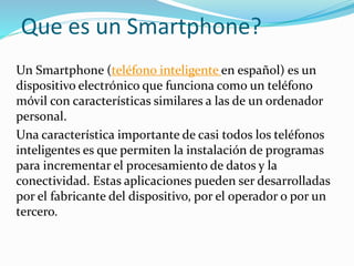 Los smartphones son teléfonos móviles con características similares a las de un ordenador personal, que permiten instalar aplicaciones adicionales. El primer smartphone fue el IBM Simon, lanzado en 1992. Los smartphones se distinguen principalmente por sus pantallas táctiles, sistemas operativos y conectividad a Internet. Los jóvenes universitarios son grandes usuarios de smartphones, que usan principalmente para redes sociales y mensajería, aunque su uso excesivo puede afectar la salud y el rendimiento académico.