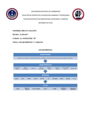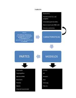 El documento describe las características y partes de los smartphones y tablets. Explica que los smartphones ofrecen más funciones que los teléfonos móviles comunes y menciona algunos modelos populares como Samsung, IPhone y Huawei. También describe las características clave de los tablets como su tamaño entre 7.9 y 10 pulgadas, procesadores de hasta 1Ghz, baterías de hasta 7000 mAh y sistemas operativos como Android 4.2. Finalmente, menciona algunas marcas populares de tablets como Lenovo, HP, Amazon y Acer