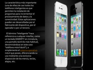 Este documento proporciona información sobre los smartphones. Explica que un smartphone es un teléfono móvil avanzado que permite la instalación de aplicaciones adicionales, tiene una interfaz como una pantalla táctil, y ofrece funciones más allá de hacer y recibir llamadas como correo electrónico y acceso a Internet. También describe algunos ejemplos populares de smartphones como los iPhone, teléfonos Android y BlackBerry. Resalta que los smartphones permiten hacer múltiples tareas al mismo tiempo como revisar la agenda mientras se ven videos.