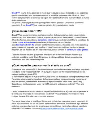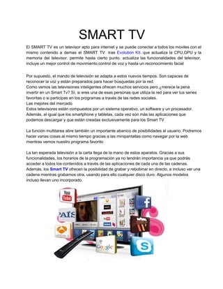 Un Smart TV es un televisor con conexión a Internet que permite instalar aplicaciones, acceder a contenido en streaming, redes sociales y navegar por la web. Los Smart TV ofrecen funciones como control por voz, reconocimiento facial y multitarea que mejoran la experiencia del usuario. Aunque requieren una inversión inicial, valen la pena para aquellos que usan la televisión para ver series y participar en redes sociales desde el sofá.