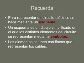 Este documento presenta los símbolos eléctricos utilizados para representar elementos en esquemas de circuitos eléctricos, incluyendo generadores como pilas y motores, receptores como bombillas y resistencias, elementos de maniobra como interruptores y pulsadores, y dispositivos como relés y conmutadores. Explica cómo dibujar cada símbolo y su significado en el circuito.