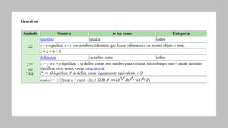El documento describe una variedad de símbolos matemáticos y sus significados en diversas áreas como aritmética, lógica proposicional, teoría de conjuntos y cálculo. Se detallan definiciones de operaciones, relaciones y propiedades de números, funciones y conjuntos. Además, se abordan conceptos fundamentales como la integral, derivada y ortogonalidad en el contexto del análisis matemático.