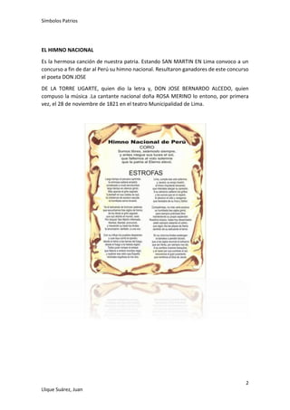 El documento resume los principales símbolos patrios del Perú: la bandera nacional representa la esencia del país a través de sus colores blanco y rojo y su historia; el escudo contiene figuras que representan la riqueza animal, vegetal y mineral del Perú; el himno nacional fue el resultado de un concurso convocado por San Martín y su letra fue escrita por José de la Torre Ugarte y su música compuesta por José Bernardo Alcedo, siendo cantado por primera vez por Rosa Merino en 1821.