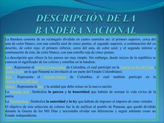 El documento describe el origen y significado de la bandera de Panamá. Fue creada en 1903 e ideada por Manuel Amador Guerrero y María Ossa de Amador. Consiste en cuatro cuarteles de colores azul, rojo, blanco y otro blanco, que representan los partidos políticos y la paz. Las estrellas simbolizan la pureza y la ley. El objetivo fue unificar a Panamá después de su guerra civil con Colombia.