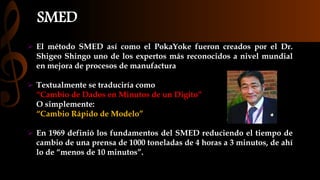 SMED es un método para reducir el tiempo de cambio de productos en una línea de producción a menos de 10 minutos. Fue desarrollado por Shigeo Shingo y reduce tiempos de cambio identificando actividades internas/externas. Poka-Yoke son dispositivos diseñados para prevenir errores durante la producción al impedir ensambles incorrectos o detectar defectos, ayudando a aumentar la calidad.