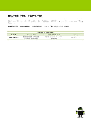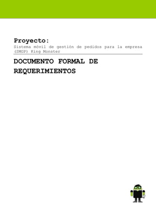 Este documento especifica los requerimientos funcionales y no funcionales para el desarrollo de un Sistema Móvil de Gestión de Pedidos (SMGP) para la empresa King Monster. El SMGP permitirá a los vendedores realizar pedidos de productos, administrar información de productos, vendedores y usuarios, y acceder a una galería de nuevos productos utilizando una aplicación móvil Android. El documento describe los requerimientos del sistema web backend y la aplicación móvil, incluyendo funciones de administración, validación de usuarios,