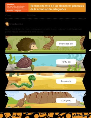 El documento presenta información sobre la acentuación ortográfica en español. Explica que las palabras se dividen en sílabas y que una sílaba es un grupo de letras que se pronuncian con un solo golpe de voz. Además, define los diferentes tipos de acento (prosódico y ortográfico) y clasifica las palabras según la sílaba tónica en agudas, graves, esdrújulas y sobreesdrújulas. Por último, incluye actividades para identificar estos conceptos.