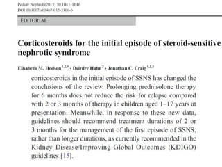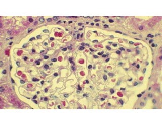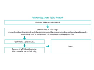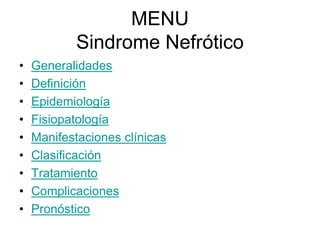 Este documento resume el síndrome nefrótico, incluyendo su definición, epidemiología, fisiopatología, manifestaciones clínicas, clasificación, tratamiento y pronóstico. El síndrome nefrótico se caracteriza por proteinuria masiva, hipoalbuminemia e hipercolesterolemia, y generalmente es el resultado de lesiones glomerulares mínimas. El tratamiento incluye dieta, esteroides e inmunosupresores, y el pronóstico depende del tipo y gravedad de la lesión renal subyacente