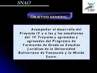 El documento describe el Sistema Nacional de Acompañamiento y Organización (SNAO) de la Universidad Bolivariana de Venezuela y la Misión Sucre. El SNAO tiene como objetivo acompañar el desarrollo del Proyecto IV y a los estudiantes del IV Trayecto. Sus objetivos específicos incluyen el seguimiento y evaluación del Proyecto IV, brindar herramientas a estudiantes y egresados, sistematizar investigaciones, y crear un sistema nacional de registro e información. El documento también describe la organización de equipos,