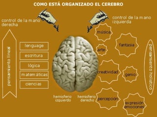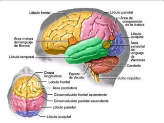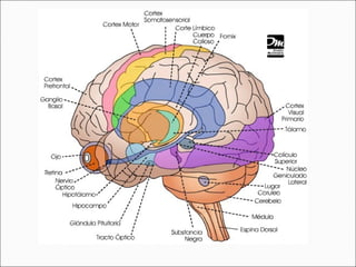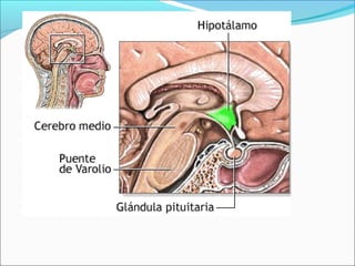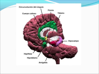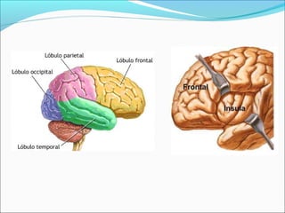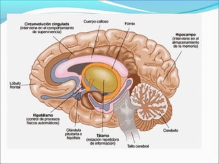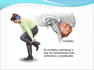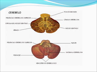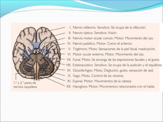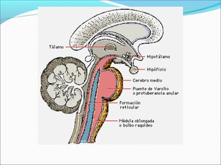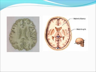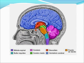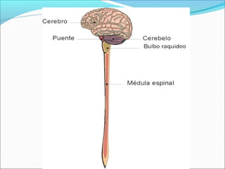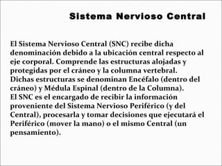 El Sistema Nervioso Central (SNC) está formado por el encéfalo y la médula espinal. El encéfalo incluye al cerebro, cerebelo y bulbo raquídeo, y está protegido dentro del cráneo. La médula espinal está protegida dentro de la columna vertebral. El SNC recibe información de los sentidos, procesa la información y controla las funciones del cuerpo.