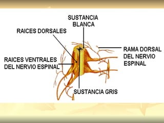 El documento resume la estructura y función del sistema nervioso central y periférico. El sistema nervioso está formado por el sistema nervioso central (encéfalo y médula espinal) y el sistema nervioso periférico (nervios). El encéfalo está formado por el cerebro, tronco encefálico y cerebelo. La médula espinal contiene sustancia gris y blanca y origina los nervios raquídeos.