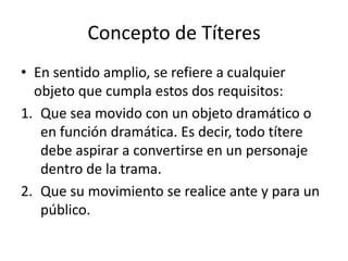 Este documento define los títeres y describe sus orígenes e historia. Según expertos, un títere es cualquier objeto movido en acción dramática ante un público. Su historia se remonta a ceremonias religiosas antiguas. Los títeres se desarrollaron en Oriente e incluyen sombras chinas, bunraku japonés y marionetas turcas. En Occidente empezaron en Grecia y continúan en Italia con Pulcinella y pupis sicilianos. Existen varios tipos como guantes, dedos, m