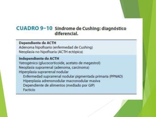 El documento describe el síndrome de Cushing, incluyendo sus causas, clasificación, fisiopatología y manifestaciones clínicas. El síndrome de Cushing se produce por un exceso crónico de glucocorticoides y puede ser debido a una enfermedad de Cushing (80% de los casos), hipersecreción ectópica de ACTH (10%) o tumores suprarrenales primarios (10%). Los síntomas incluyen obesidad central, cambios cutáneos, hirsutismo e hipertensión.