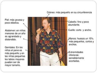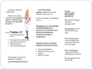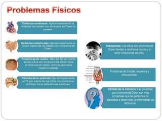 El síndrome de Down es causado por la presencia de un cromosoma 21 extra y se caracteriza por discapacidad cognitiva y rasgos físicos. Fue descrito por primera vez en 1866 y en 1958 se descubrió que es una alteración cromosómica. No tiene cura pero las personas reciben apoyo para desarrollar sus capacidades.
