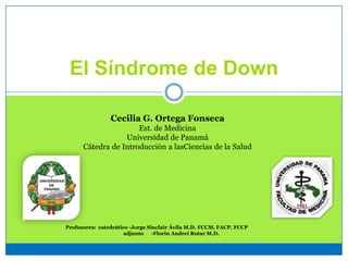 El documento describe el Síndrome de Down, incluyendo sus causas, características y condiciones asociadas. El Síndrome de Down es causado principalmente por la trisomía del cromosoma 21 y se presenta en aproximadamente 1 de cada 800 nacimientos. Las personas con Síndrome de Down generalmente presentan retraso mental y características físicas distintivas, así como un mayor riesgo de defectos cardíacos y otros problemas de salud. Aunque el Síndrome de Down no tiene cura, el tratamiento y el apoyo pued