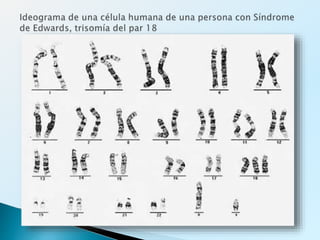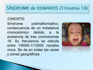 El síndrome de Edwards, causado por una trisomía del cromosoma 18, afecta aproximadamente a 1 de cada 6,000-13,000 nacidos vivos y se manifiesta a través de múltiples anomalías físicas y complicaciones médicas. La mortalidad es alta, alcanzando el 95% en el primer año de vida, y los supervivientes enfrentan numerosos problemas de salud, siendo más comunes las cardiopatías congénitas y las dificultades en el desarrollo. Esta condición fue descrita por primera vez en 1960 y no se conoce una causa específica para los errores cromosómicos que la producen.