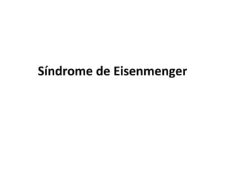 El síndrome de Eisenmenger es un trastorno en el que la presión sanguínea en los pulmones se eleva demasiado como resultado de defectos cardiacos congénitos no tratados, lo que causa cianosis, fatiga y dificultad para respirar. Se diagnostica mediante exámenes de sangre, radiografías, ecocardiogramas y cateterismos cardiacos. El tratamiento se enfoca en reducir la presión pulmonar con medicamentos y, en casos graves, con trasplantes.