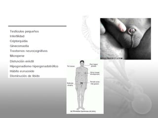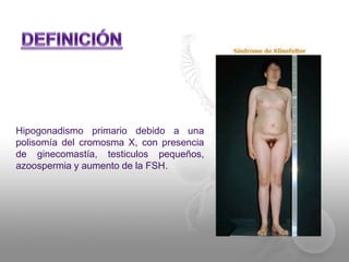 El documento describe el síndrome de Klinefelter (SK), una condición genética causada por la presencia de al menos un cromosoma X extra en los hombres. Los principales síntomas incluyen hipogonadismo, ginecomastia, testículos pequeños y azoospermia. El SK se asocia con un mayor riesgo de osteoporosis, cáncer de mama, enfermedades autoinmunes y problemas de desarrollo e intelectual. El tratamiento consiste en reemplazo de testosterona de por vida para prevenir complicaciones.