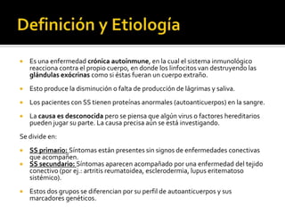 El síndrome de Sjögren es una enfermedad autoinmune crónica en la que el sistema inmunológico ataca y destruye las glándulas exócrinas, causando sequedad en los ojos y la boca. Los pacientes con este síndrome tienen autoanticuerpos anormales en la sangre y experimentan síntomas como ojos y boca secos, aunque la causa exacta sigue sin conocerse. Se divide en primario y secundario dependiendo de si existe o no otra enfermedad del tejido conectivo asociada.