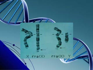 El síndrome de X frágil es una enfermedad genética ligada al cromosoma X que causa deficiencia mental y es la primera causa hereditaria de retraso mental. Se produce por una mutación en el gen del cromosoma X que contiene repeticiones anormales del trinucleótido CGG. Afecta más a niños que a niñas, causando rasgos físicos como cara alargada y orejas grandes, así como retraso en el desarrollo motor y lenguaje y problemas de conducta. No tiene cura pero los tratamientos mé