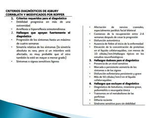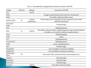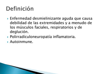 El síndrome de Guillain-Barré es una enfermedad autoinmune que causa debilidad muscular y a veces parálisis. Se caracteriza por una inflamación de los nervios periféricos que puede provocar entumecimiento, dolor y pérdida de reflejos. Los síntomas suelen aparecer rápidamente en un periodo de horas o días y empeoran en las primeras semanas. El tratamiento con inmunoglobulina intravenosa o plasmaféresis puede ayudar a reducir la gravedad y duración de los síntomas.