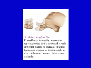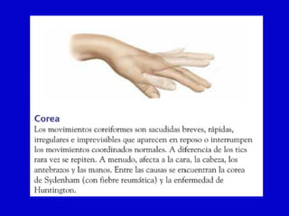 Este documento describe el sistema extrapiramidal, los síndromes extrapiramidales y sus manifestaciones clínicas. Explica que el sistema extrapiramidal controla los movimientos voluntarios y el tono muscular, y participa en los movimientos automáticos. Los síndromes extrapiramidales se deben a la disfunción de los ganglios basales y sus conexiones, y se manifiestan a través de trastornos del movimiento, el tono y la postura. Describe en detalle diferentes trastornos como temblor, corea, distonía