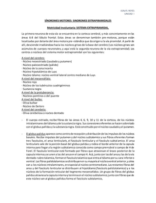 Este documento describe el sistema extrapiramidal, incluyendo sus principales centros y vías. El sistema extrapiramidal mantiene el balance, postura y equilibrio durante los movimientos voluntarios y controla los movimientos asociados o involuntarios. Los principales centros son los núcleos basales como el estriado, globo pálido y sustancia negra, así como el núcleo rojo y formación reticular. Las vías incluyen las vías tectoespinal, rubroespinal, reticuloespinal y olivoespinal. El documento