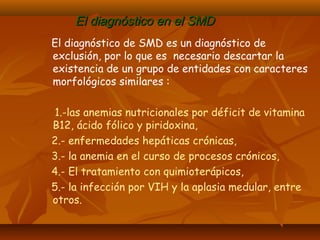 2. El diagnóstico de SMD requiere descartar otras causas de anemia y confirmar la presencia de displasia mediante un examen de la médula ósea.