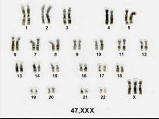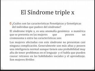 El síndrome triple x se presenta en mujeres que tienen un cromosoma x extra. Generalmente las mujeres con este síndrome son más altas y tienen inteligencia normal, pero también tienen mayor probabilidad de problemas en el lenguaje, aprendizaje y habilidades sociales. Se diagnostica mediante un cariotipo que examina los cromosomas. No tiene tratamiento para corregir los cromosomas, pero se enfoca en limitar problemas de comportamiento, aprendizaje y trastornos neurológicos a través de apoyo escolar y tratamiento psiquiátrico si es neces