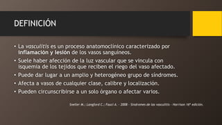 Este documento describe los síndromes de las vasculitis, definidos como inflamación y lesión de los vasos sanguíneos que puede afectar vasos de cualquier tamaño y ubicación. Se clasifican según su etiología, patogénesis, tipo de vaso afectado y manifestaciones clínicas. Algunos ejemplos son la arteritis de la temporal que afecta grandes vasos, la poliarteritis nodosa que afecta vasos medianos y la granulomatosis de Wegener que afecta pequeños vasos.