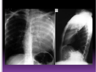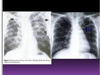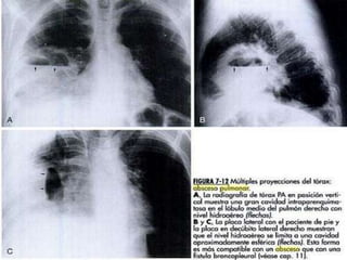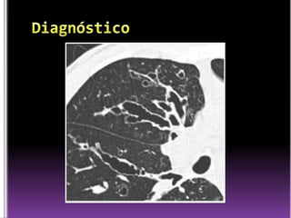 El documento presenta información sobre la fisiopatología de diferentes afecciones pulmonares como la bronquiectasia, tuberculosis, enfisema y neumotórax. Explica los mecanismos fisiopatológicos, manifestaciones clínicas, hallazgos en la exploración física y tratamiento de estas enfermedades.