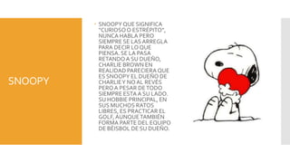 Este documento presenta a los principales personajes de la tira cómica Peanuts. Incluye breves descripciones de Snoopy, Charlie Brown, Lucy, Linus, Sally Brown, Peppermint Patty, Schroeder, Woodstock, Franklin, Pig Pen y Rerun, destacando sus rasgos de personalidad y su relación con otros personajes como Charlie Brown y Snoopy.
