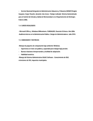 Este documento presenta el currículum de Lilian Coromoto Gutiérrez Muñoz. Detalla su información personal como fecha de nacimiento, estado civil y educación que incluye una licenciatura en Administración con mención en Informática. También describe su experiencia laboral en cargos como jefe de secretaría, analista y secretaria privada. Finalmente, resalta sus habilidades como el manejo de paquetes de computación y experiencia en trato con público.