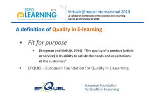 El documento aborda los criterios de calidad en el e-learning, destacando la importancia de la utilidad, usabilidad, aceptabilidad y el diseño centrado en el estudiante. Se resalta que la calidad debe ser evaluada desde una perspectiva integral, considerando la experiencia de aprendizaje y la interacción en entornos virtuales. Además, se proponen criterios específicos para la educación médica continua y e-learning corporativo, enfatizando la necesidad de coherencia y efectividad en los procesos educativos.