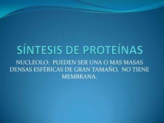 El documento describe la estructura y función del nucleolo. El nucleolo está formado por dos zonas: la fibrilar interna que contiene ADN, y la granular externa que contiene ARN y proteínas. Se produce a partir de regiones específicas del ADN llamadas regiones organizadoras del nucleolo. El nucleolo es fundamental para la síntesis de proteínas al transcribir el ARNr necesario para formar los ribosomas.