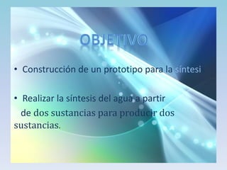 Este documento describe un prototipo para sintetizar agua a partir de hidrógeno y oxígeno. Instruye medir volúmenes de agua y marcar niveles en un frasco. Luego, genera hidrógeno usando electrodos de níquel en una cuba con agua y sal, y genera oxígeno usando levadura y agua oxigenada en un frasco bial. Finalmente, captura los gases en el frasco para sintetizar agua.