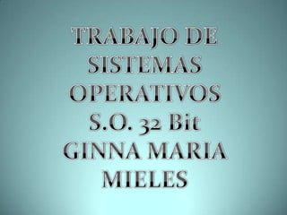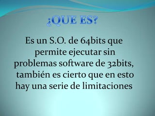 Este documento describe las características de un sistema operativo de 64 bits. Explica que permite usar más de 4GB de memoria RAM, pero que los drivers y software de 16 bits no son compatibles. También señala que aunque se puede usar más memoria, la información ocupará más espacio. Finalmente, indica que los programas de 32 bits funcionan igual, y que los sistemas de 64 bits son más rápidos, estables y seguros aunque también más caros.