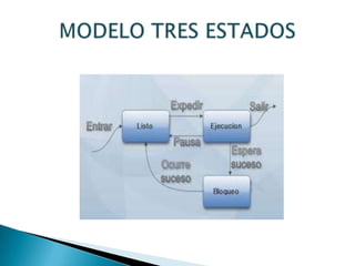 Este documento describe los modelos de estado y transiciones de procesos. Explica que un estado es una configuración única de información y una transición es un cambio de estado. Los procesos pueden estar en ejecución, listos para ejecución o bloqueados. El modelo de tres estados divide el estado de no ejecución en listo y bloqueado, mientras que el modelo de cinco estados agrega estados nuevo y terminado.