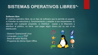 El documento proporciona información sobre sistemas operativos comerciales y de código abierto. Describe varias distribuciones de Linux como Linux, Ubuntu y Fedora. También cubre versiones clave de Mac OS desde 1984 hasta 2015 y versiones de Windows desde 1981 hasta 2015. Resalta eventos importantes en el desarrollo y lanzamiento de cada sistema operativo.