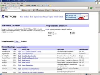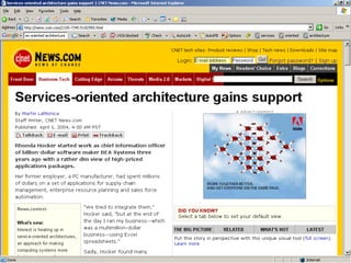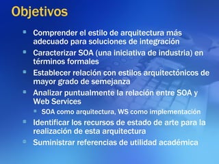 El documento presenta una introducción a la Arquitectura Orientada a Servicios (SOA). Explica que SOA es un estilo arquitectónico que define la funcionalidad de una aplicación como conjuntos de servicios independientes con interfaces bien definidas. También analiza la relación entre SOA y los servicios web, y compara SOA con estilos arquitectónicos anteriores como los objetos y componentes distribuidos. Finalmente, discute cómo SOA se relaciona con otras tecnologías emergentes como la computación en la nube.