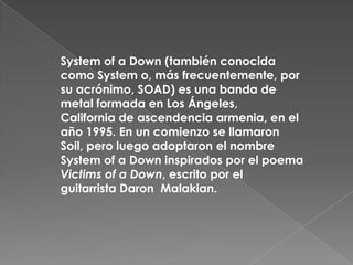 System of a Down es una banda de metal formada en Los Ángeles en 1995 por músicos de ascendencia armenia. Originalmente se llamaron Soil pero luego cambiaron su nombre a System of a Down, inspirados por un poema escrito por el guitarrista Daron Malakian.