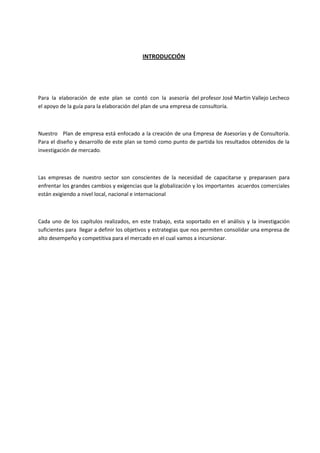 Este documento presenta un plan de negocios para una empresa de consultoría y asesoría. El plan incluye una introducción, dedicatoria, giro, misión, visión, objetivos y análisis FODA. El plan propone crear una empresa que brinde servicios de mejora en ventas y atención al cliente a empresas medianas a través de técnicas de marketing, con el objetivo de convertirse en un referente de asesoría a nivel nacional.
