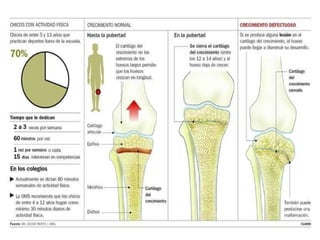 El documento describe el sistema osteo-artro-muscular, incluyendo los diferentes tipos de tejidos que lo componen como el tejido conectivo, muscular y nervioso. Explica la anatomía y fisiología de los huesos, articulaciones y músculos, y cómo permiten el movimiento del cuerpo. También cubre las características, funciones y enfermedades del esqueleto.