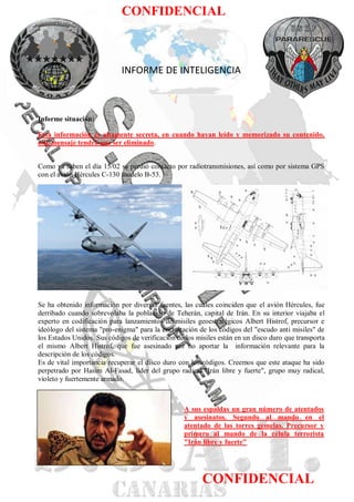 El documento resume una misión secreta para recuperar un disco duro con códigos de misiles estadounidenses que cayó en manos de fuerzas iraníes después de que un avión fue derribado sobre Irán. Un equipo debe infiltrarse, recuperar el disco duro de un fuerte iraní, introducir los códigos en un ordenador conectado a un satélite, defender la posición durante 30 minutos, y luego extraerse en 15 minutos cuando lleguen helicópteros de apoyo.