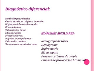Este documento resume conceptos clave sobre el síndrome de obstrucción bronquial (SOB) y el asma en niños. Explica que el SOB es la manifestación clínica más común de la obstrucción de la vía aérea en menores de 5 años, generalmente causada por infecciones virales. También describe que el asma es una enfermedad bronquial crónica que comienza a menudo en la infancia y tiene un gran impacto en la calidad de vida. Finalmente, resume los mecanismos de inflamación y obstrucción que subyac