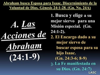 Abraham envía a su siervo más viejo a Mesopotamia para buscar esposa para su hijo Isaac. El siervo ora a Dios pidiendo una señal, y Rebeca ofrece agua a él y sus camellos, cumpliendo la señal. El siervo da gracias a Dios por haber guiado con éxito su misión para encontrar esposa para Isaac.